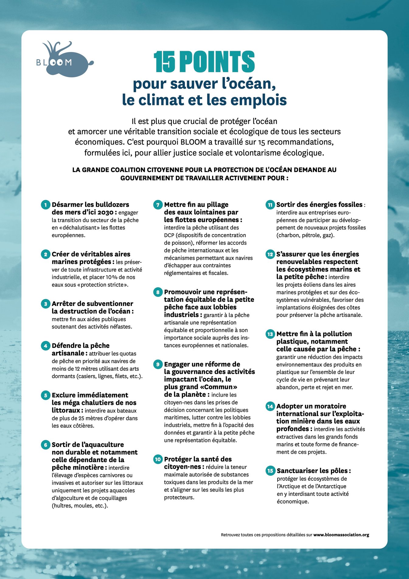 L’émission de Swann Pérrissé avec la fondatrice de Bloom, Claire Nouvian, dans laquelle j’ai appris l’existence de marées verticales, la nuit, dans l’Océan. Bloom lance d’ailleurs cette semaine une Coalition pour l’Océan à laquelle je m’associe personnellement. Alors que 2024 est désignée “Année de la mer” par le Président, et que la France accueillera à Nice en juin 2025, le sommet international de l’ONU sur l’océan, nous devons absolument pousser la France à montrer l’exemple et mettre en place des mesures de protection à la hauteur des enjeux climatiques. Voilà les 15 points essentiels sur lesquels insister pour l’ONG :